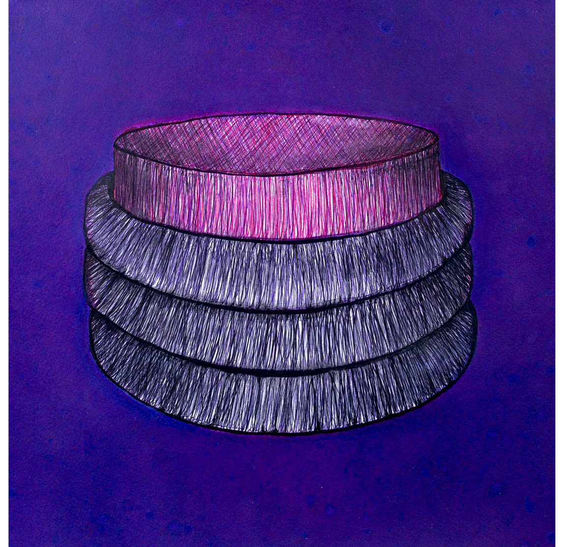 In the fourteenth century, the Assyrian Church of the East stripped the artwork from its walls. As a result, Assyrian society’s embrace of visual art has diminished over time. This series strives to revitalize it, restoring art to the Church by using familiar Church symbols as subject matter. Each symbol is cut as a stencil. The intricate horizontal and vertical line work drawn into the negative spaces leaves etched markings in the symbols, linking them to carvings in ancient Assyrian bas reliefs.