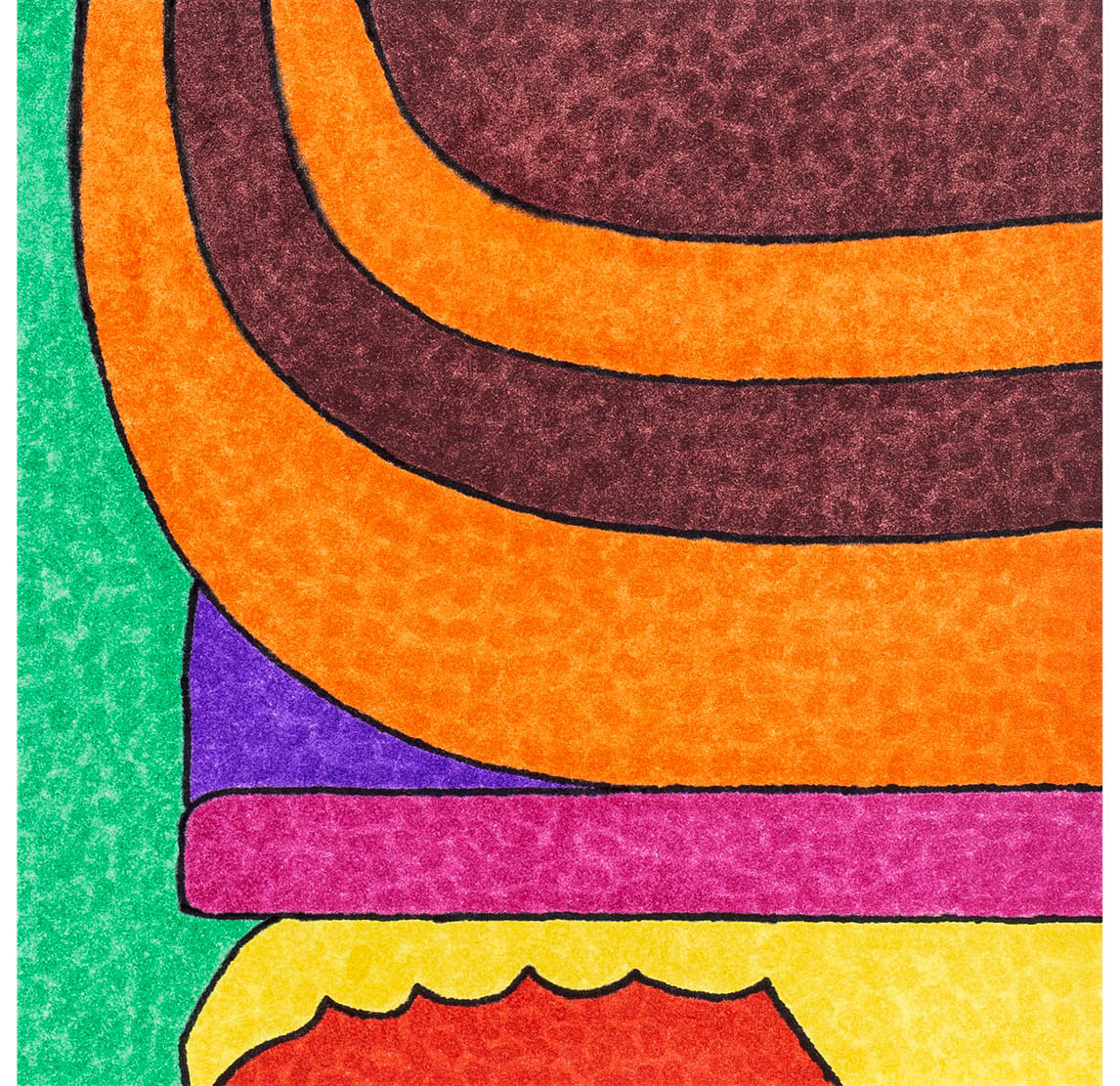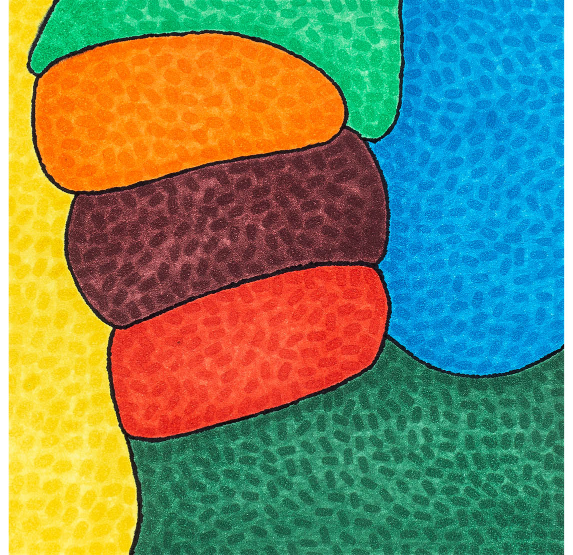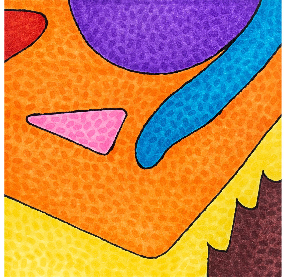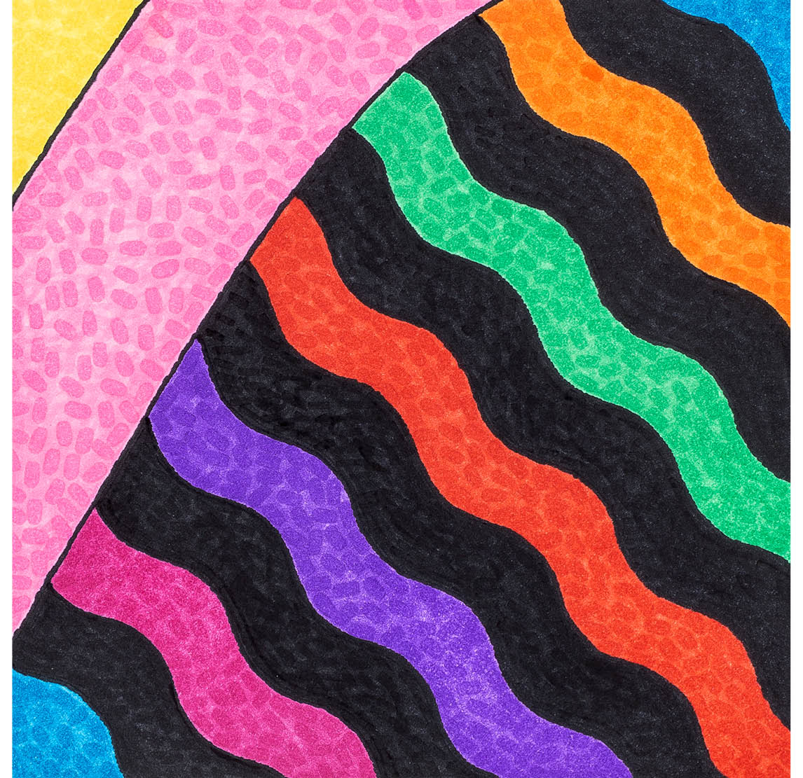 This series began as a search for new compositions. Referring to ancient Assyrian art, Rabel cropped in tight on some details, and abstract shapes emerged. Outlined with thin, ragged lines, shapes are filled with vibrant color combinations. The confetti-like textures strewn over the composition refer to Akitu parade celebrations.