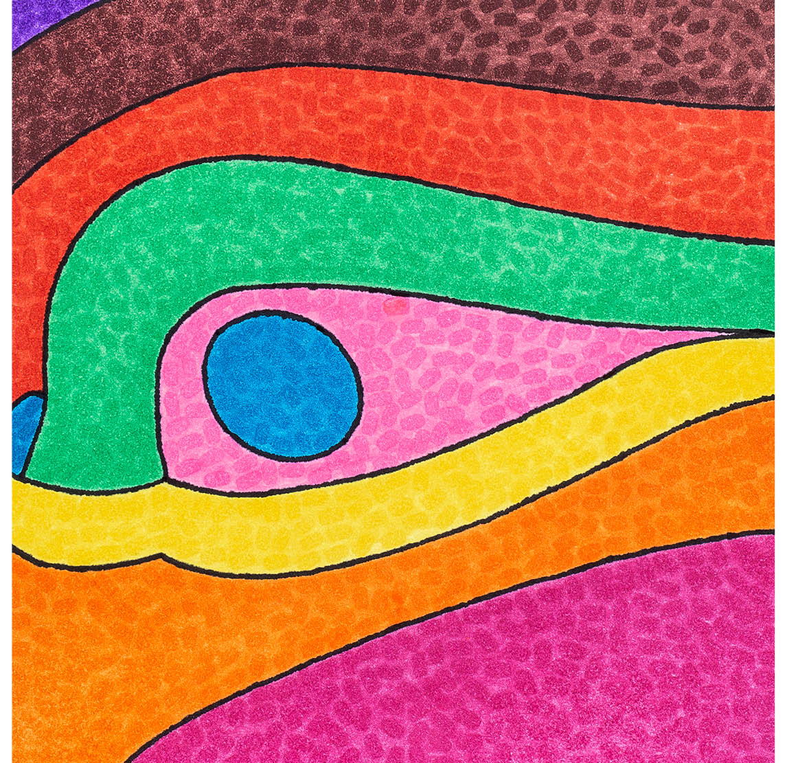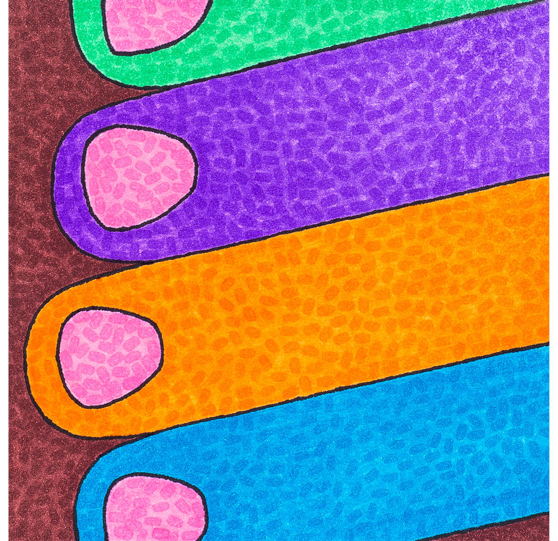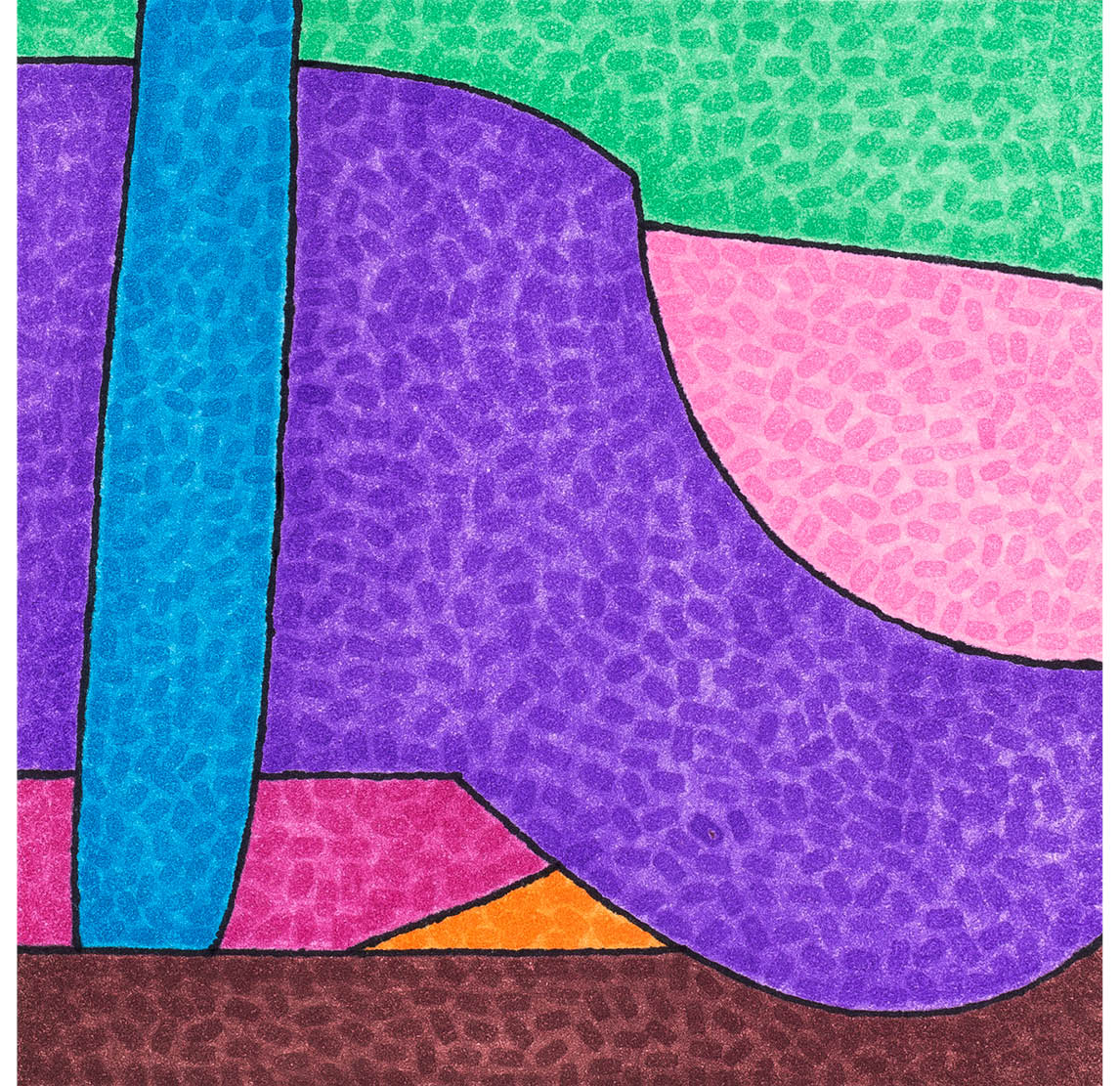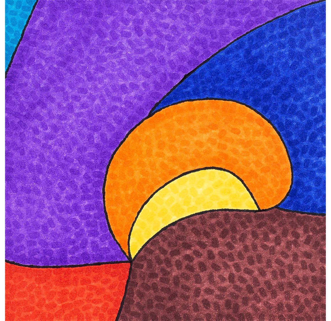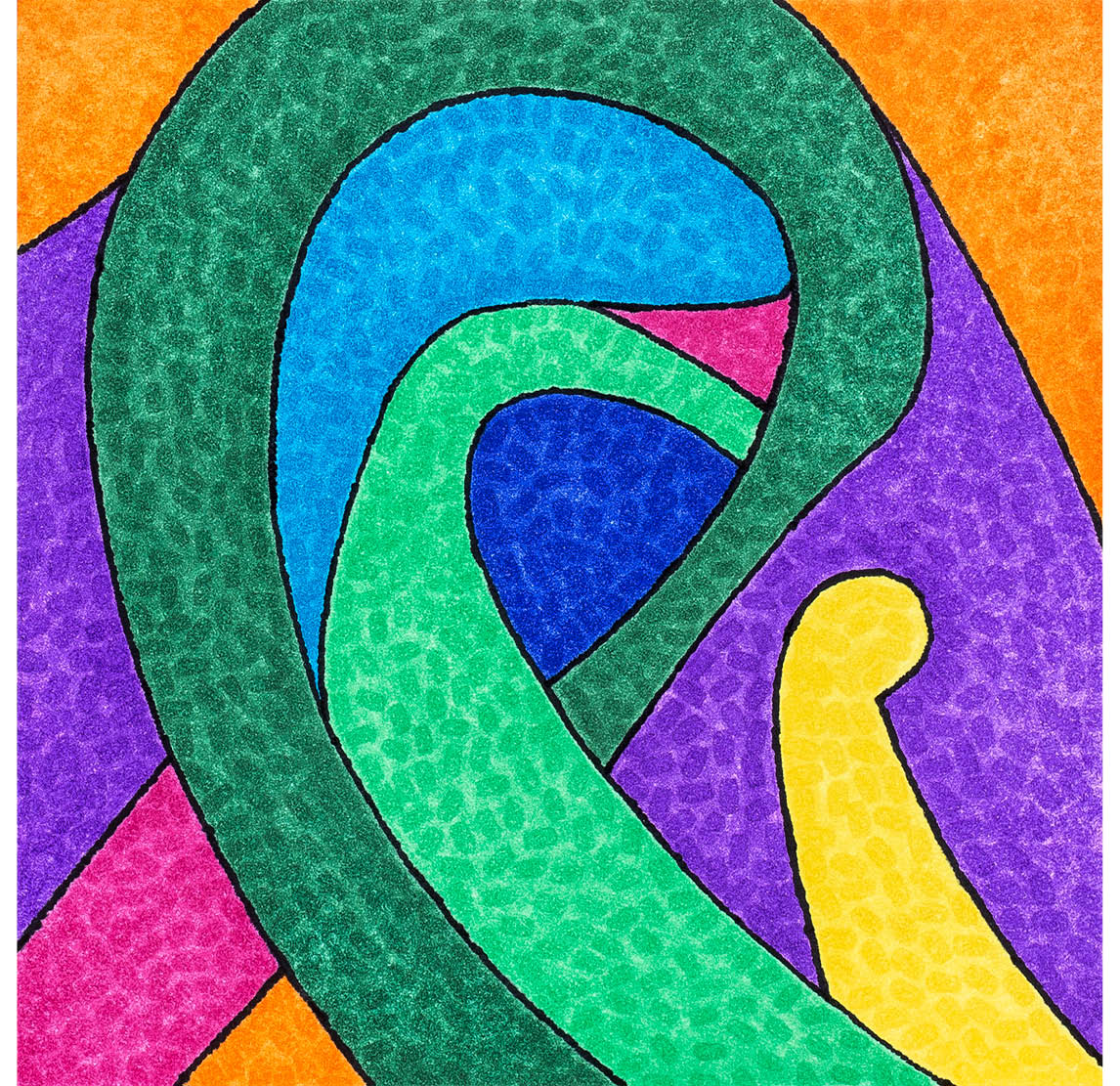 This series began as a search for new compositions. Referring to ancient Assyrian art, Rabel cropped in tight on some details, and abstract shapes emerged. Outlined with thin, ragged lines, shapes are filled with vibrant color combinations. The confetti-like textures strewn over the composition refer to Akitu parade celebrations.