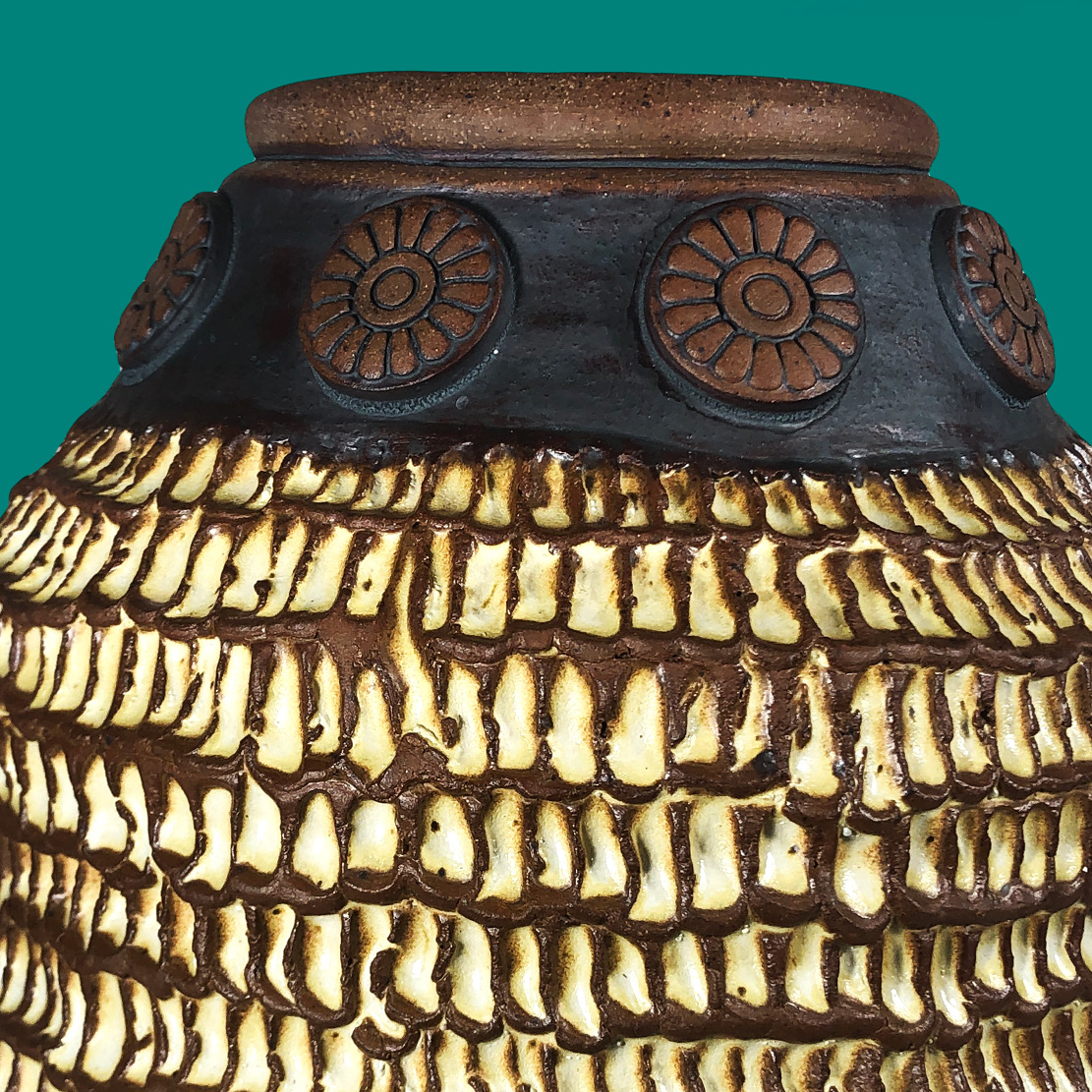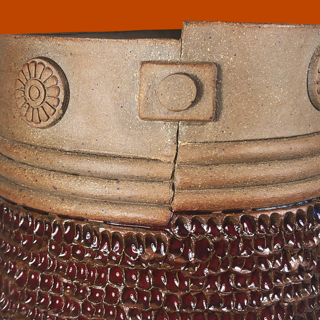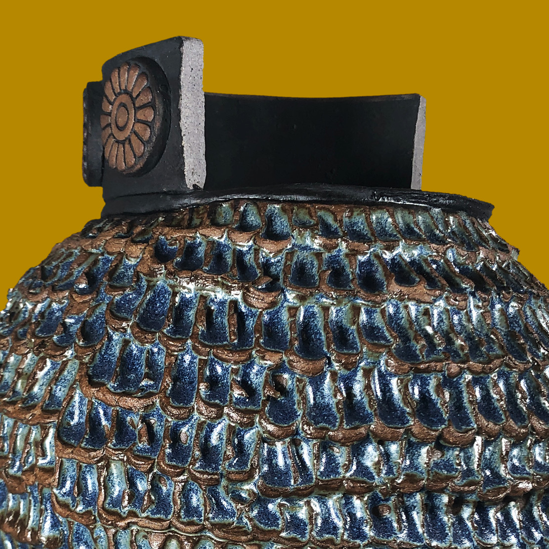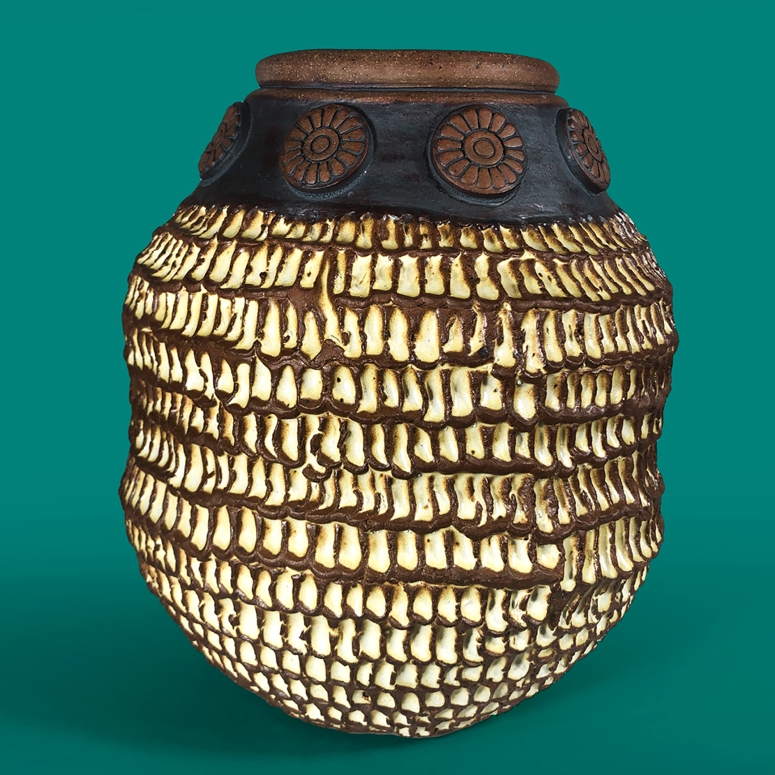 While they’re inspired by royalty, the functional vessels of the Neo Palace Ware series are informal enough to use and enjoy at home. Hand-built using extruded coils, each pot is shaped into a unique form and crowned with the ancient Assyrian rosette. The rosette pattern is created using a 3D printer; each model is molded into a ceramic form used to produce individual pieces. Instead of a title, an alphanumeric designation is assigned to each piece for the purpose of treating it as a relic of the past.