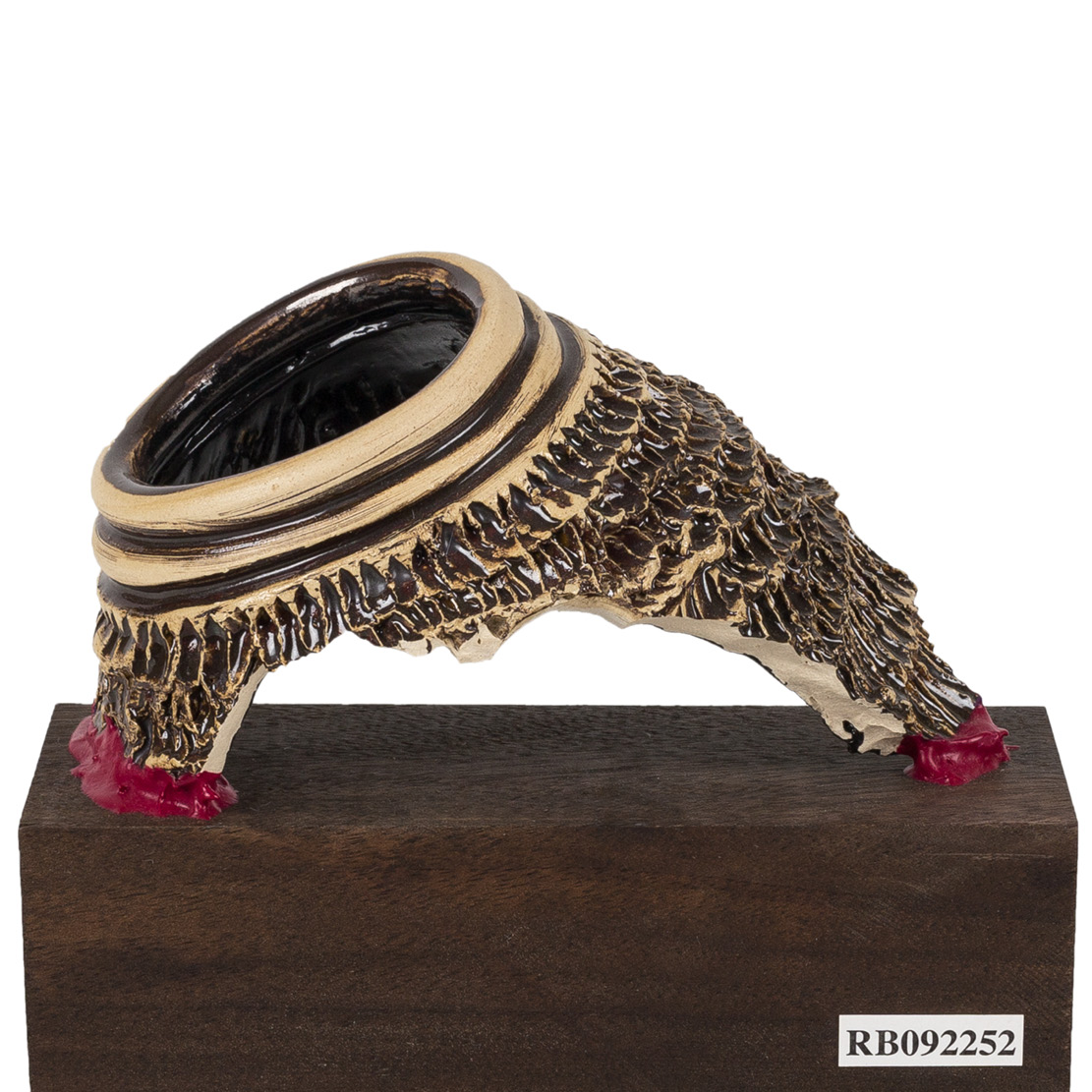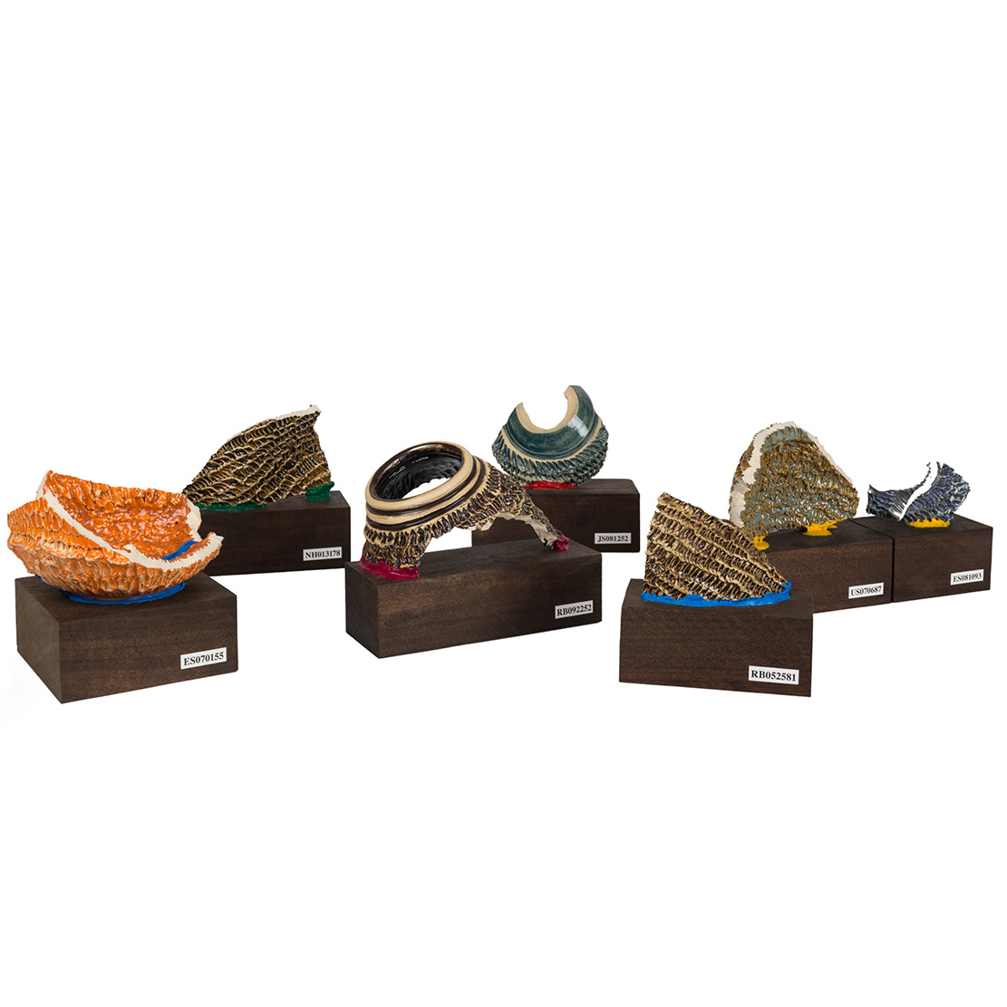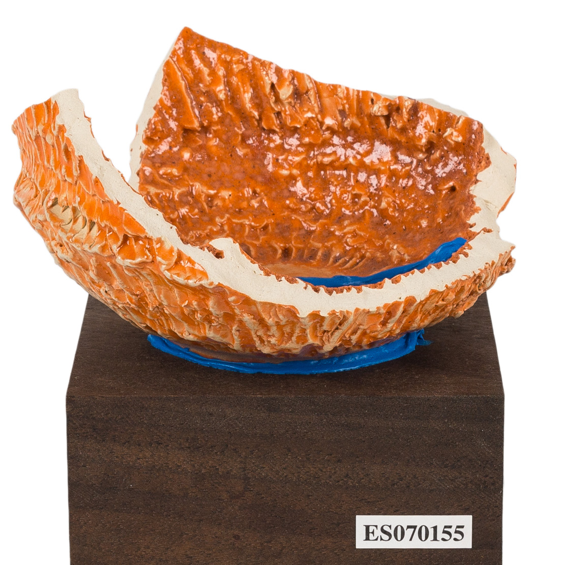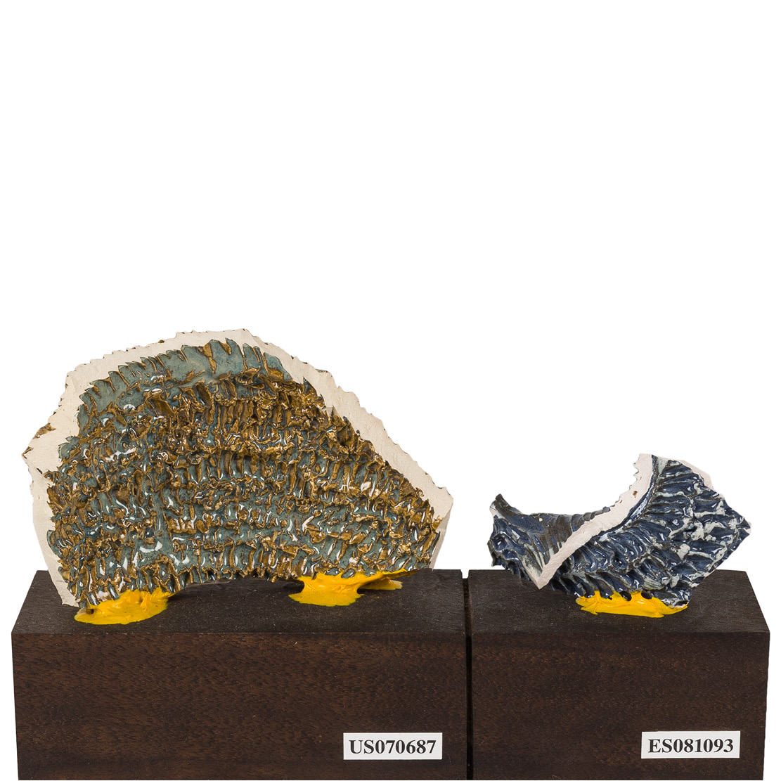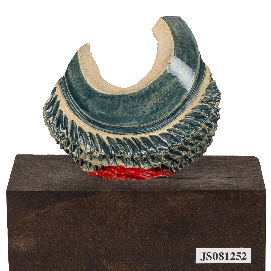 This series carries anger, frustration and a yearning to do something new by breaking what was done in the past. Rabel broke his own finished vases, feeling great—like leaving a bad relationship. The clay and ceramic pay tribute to his sense of homeland. He brought the organic, abstract pieces together to express the connection he feels to his history and culture. In mounting them on wood, he honors their importance as part of history, as if to acknowledge that these used to serve practical functions, and they now exist simply to be remembered. In securing the ceramic to the wood, the colored molding paste acts as the bond between history, stability and strength.